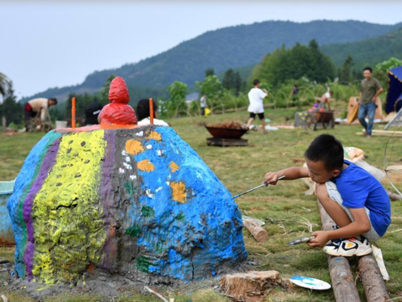 小朋友在大元社草坪剧场的陶土装置上绘画。图片来源:新华社