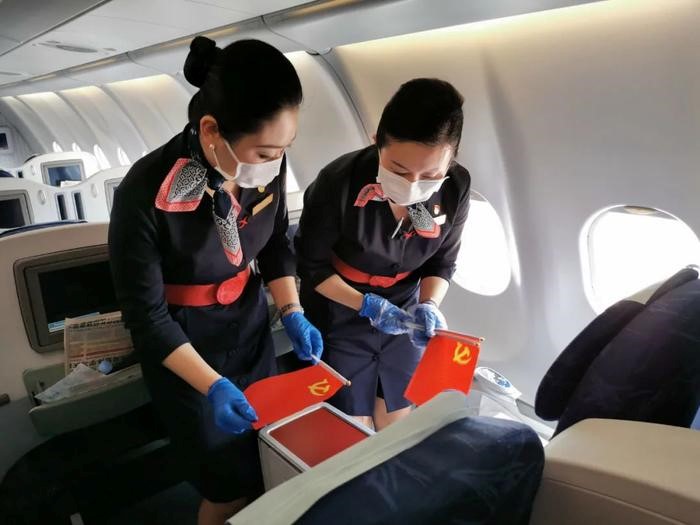 李文丽(右)带领工作室成员执飞“七一”主题航班。图片来源:海峡网