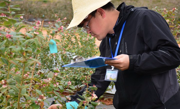 梁名双在观察蓝莓长势。图片来源:普洱日报