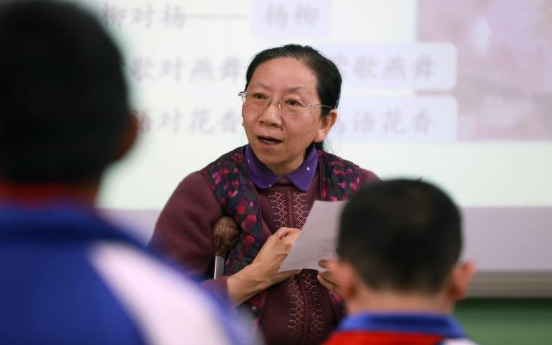 “古对今,圆对方。严寒对酷暑,春暖对秋凉……”清晨,稚嫩的童声,伴随着“叽叽喳喳”的鸟鸣回荡在校园。这里是甘肃省白银市白银区水川镇白茨滩小学。教室里,一名拄着双拐、步履蹒跚的老师带领几名一年级学生进行早读。