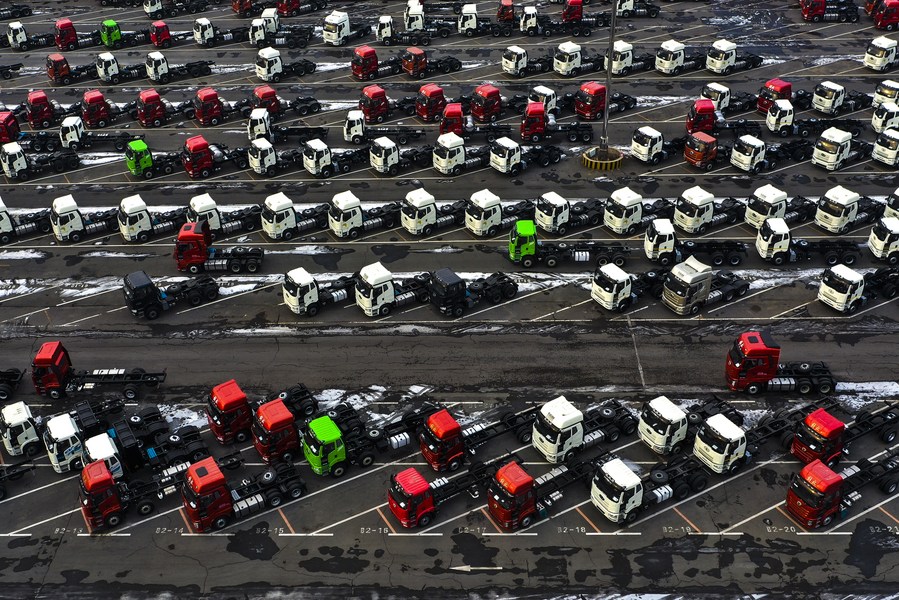 This aerial photo taken on Jan. 31, 2023 shows vehicles to be delivered at a parking lot of the FAW Jiefang in Changchun, northeast China's Jilin Province. (Xinhua/Xu Chang)