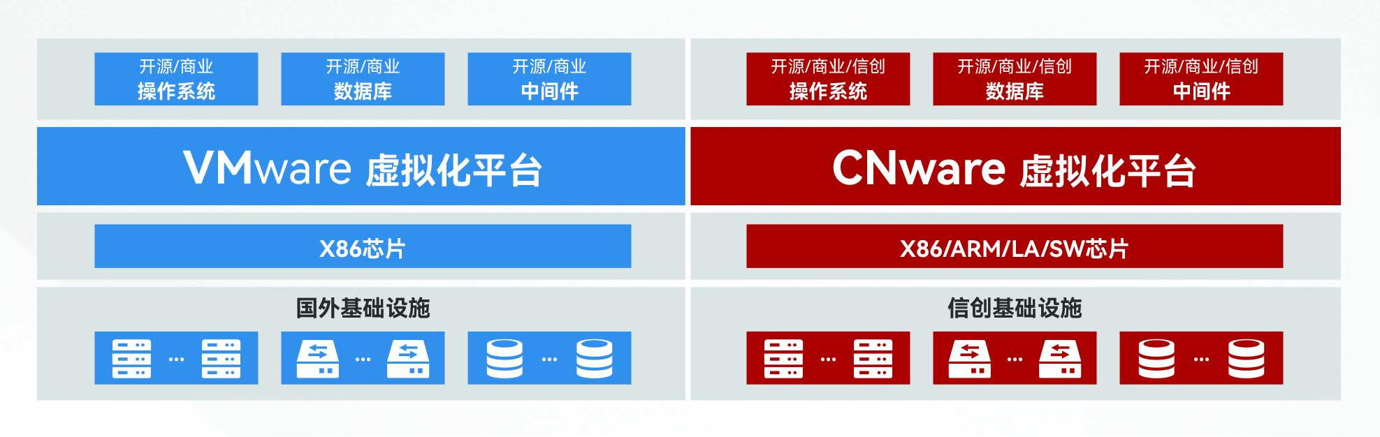 云宏CNware作为一款对标VMware的国产虚拟化软件,在基础设施架构定位上与VMware完全一致。通过全面支持VMware vSphere API接口,实现了资源的统一监控与管理,并在保证CNware与VMware在客户系统环境内“双轨并行”的基础上,逐步完成应用数据和底层架构的迁移与升级,让业务运行零中断、迁移无感知,用户体验无变化。同时,云宏CNware在计算性能、存储性能、网络性能以及性能损耗等方面均与VMware相似,无感同位替换让运维人员几乎无需学习成本,即可轻松实现平行替代。
