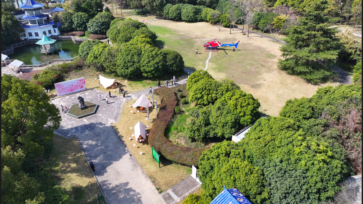 随着直升机腾空而起,游客们瞬间被眼前的景象所震撼。从高空俯瞰,无锡的樱花如同一片片粉色的云朵,点缀在绿色的田野和湖泊之间,美不胜收。直升机沿着设定的航线巡航,飞行高度保持在100米左右,让游客们能够清晰地看到每一朵樱花。