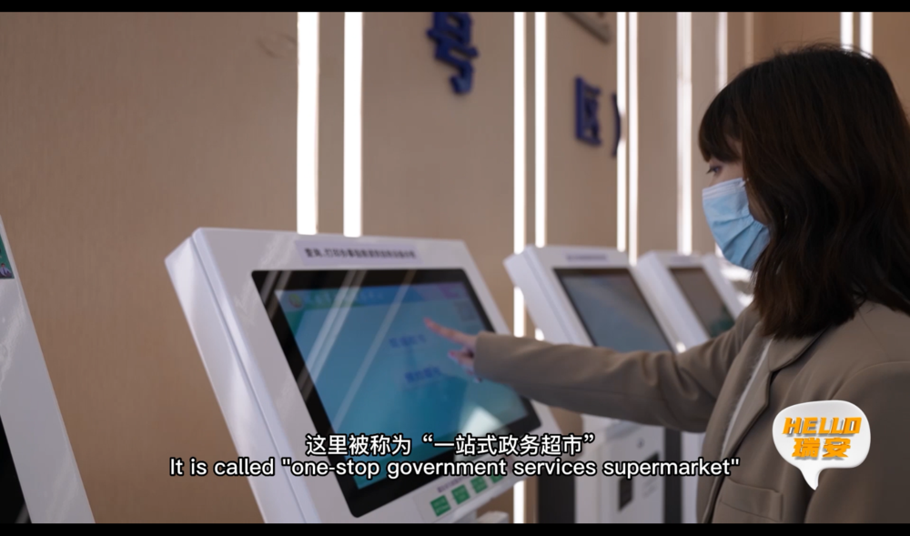 Elly还学会了用微信小程序查询公交线路和车辆到站情况,非常方便地乘坐公交车到了瑞安市行政服务中心。这里被称为“一站式政务超市”,各审批分中心在这里集中办公,为市民提供一站式服务,还有许多业务可以自助办理。