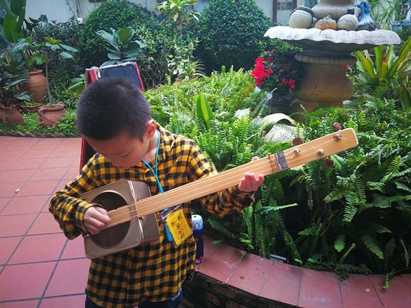 Gao, who is good with his hands, turned some of the garbage into musical instruments and showed the inquisitive children how to make percussion instruments out of bottles and boxes.