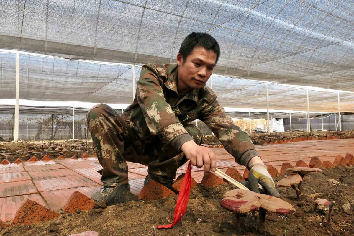 Li Yufeng, an employee at the lingzhi mushroom garden in Hongqi, checks the growth of the fungus in a greenhouse.