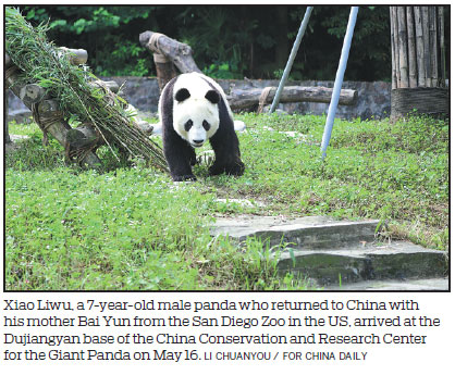 While Tai Shan, who charmed millions of Americans during his stay at the Smithsonian's National Zoo in Washington for four and a half years, has adapted well to his new home in China, Xiao Liwu, a 7-year-old male panda who returned with his mother Bai Yun from the San Diego Zoo in the US on May 16, is gradually adapting to the base.