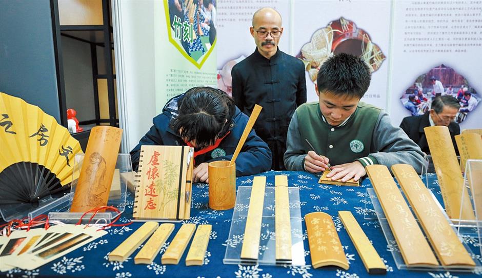 Young people take bamboo carving lessons in Jiading where a variety of activities are available to pass on the traditional cultural heritage.