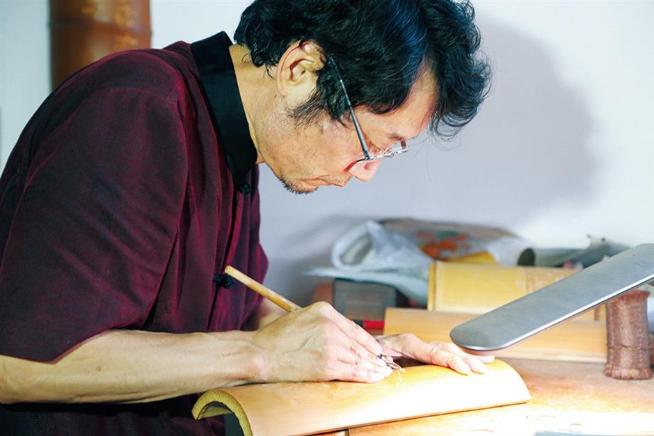 Bamboo carving master Zhang Weizhong works at his studio in Jiading.