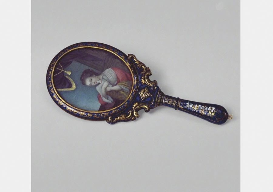An oval painted enamel hand mirror with an image of a Western female from the Qing Dynasty. [Photo/Official Weibo account of the Palace Museum]