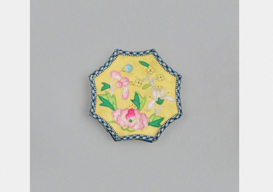 A yellow handmade compact embroidered with auspicious patterns from the Guangxu period of the Qing Dynasty. [Photo/Official Weibo account of the Palace Museum]
