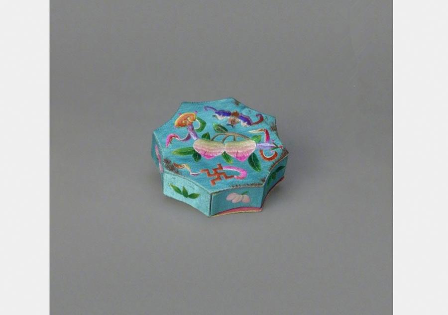 A light green handmade compact embroidered with auspicious patterns from the Guangxu period of the Qing Dynasty. [Photo/Official Weibo account of the Palace Museum]