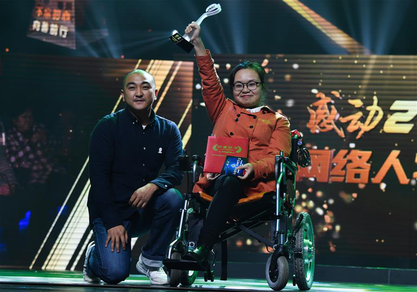 Du Chengcheng (R) receives a trophy at an awards ceremony held by Xinhua News Agency in January 2018. She was voted as one of the inspirational online figures of 2017.