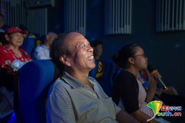 An elderly man smiles whilst he listens to Du Chengcheng's explanation of a film in July 2017.