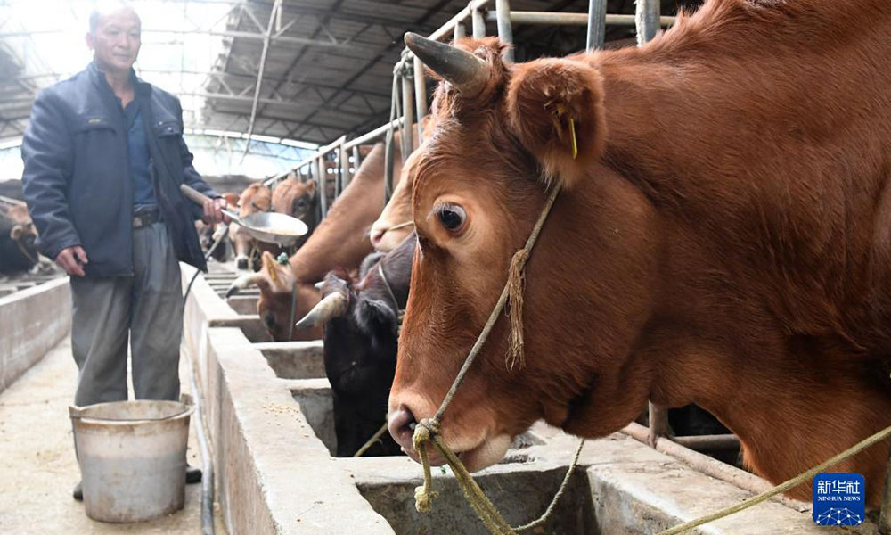 Le aree colpite dalla povertà nella provincia del Guangxi, in Cina, hanno raggiunto la rivitalizzazione rurale attraverso l'allevamento dei bovini.